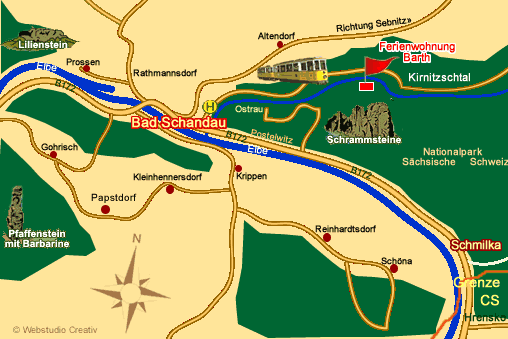 Anreise von Dresden über die A17 bis Abfahrt Pirna, weiter in Richtung Pirna - Bad Schandau. Sie kommen direkt auf die B172 und fahren bis Bad Schandau. Nach dem Marktplatz fahren Sie an der nächsten Kreuzung links ab in Richtung Hinterhermsdorf. Sie fahren bis zum Campingplatz Ostrauer Mühle und dann gerade durch den Campinplatz zu unserer Ferienwohnung. |
